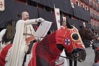 A primera hora de día, a las 8.30, cuando aún está presente la emoción por las procesiones del Jueves Santo y la madrugada, el hermano cofrade a caballo Álvaro Gimeno había recogido en el Palacio Arzobispal, de manos del arzobispo Luis Argüello, el pergamino del Pregón que fue leído en 13 localizaciones de la ciudad, donde anima a los fieles a acudir al mediodía a la Plaza Mayor para escuchar las últimas palabras de Jesús en la cruz.